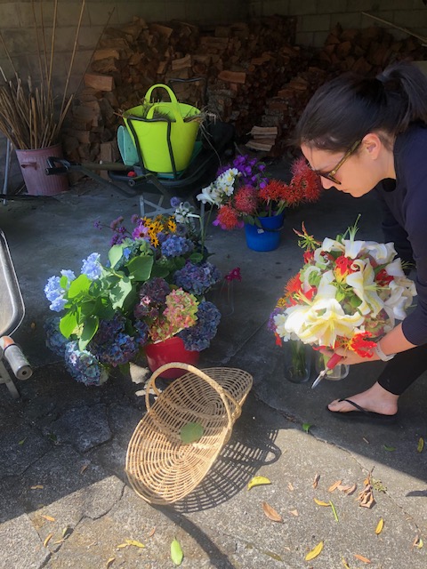 February was marked by a bit of a rollover from January, notably auratum lilies, gloriosas and Scadoxus ssp multiflorus katharinae. All are excellent cut flowers. I knew the lilies were but I have never cut the scadoxus before and they show a remarkably long vase-life. This discovery was made because our middle child came home for a small, intimate wedding in the garden here – an event we never expected to see. In the spirit of this informal occasion where the vows were both heartfelt and a central part of the whole event, she did her own wedding flowers from the garden here. She made her posy and a smaller one for their two year old to carry as well as the vases for the long table while I did the big showy vases of OTT lilies – mostly auratums but with a few Lilium formasanum and belladonnas.