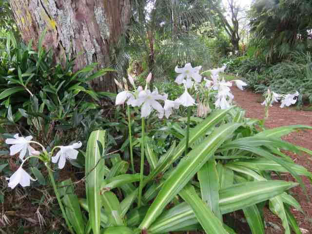 Crinum moorei variegated has spectacular foliage in late spring and early summer but the foliage starts to whiff off a bit, sometimes losing its variegation, as the perfect, white, scented blooms open. I would prefer it to time the foliage and the flowers to perfection but the gardener’s personal preference is irrelevant. It remains an excellent bulb, showy for a long period with the foliar lead-in followed by lovely blooms. We always grow it in the shade gardens because that foliage will burn in our bright summer sun.