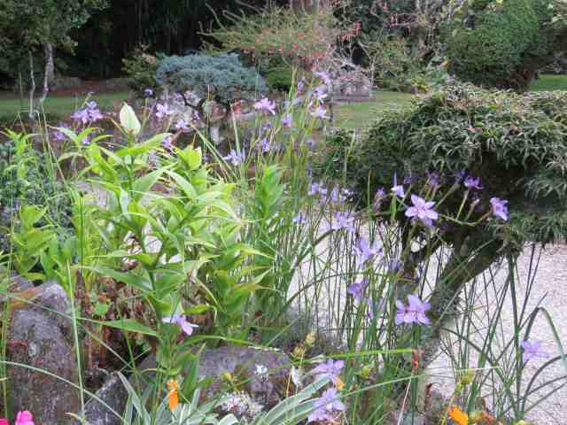 The moraea family is a large one of many different species, the most common being M. villosa and M. aristata – the spring flowering peacock iris. Some are invasive and some are not worth having, but in autumn each year, Moraea polystachya delights us with its blue iris flowers. It sets plenty of flowers down the stem, unlike many bulbs that set just one bloom per stem. It seeds down but not badly enough for us to decide it is invasive and dangerous. It is just gently spreading and generally delights us,