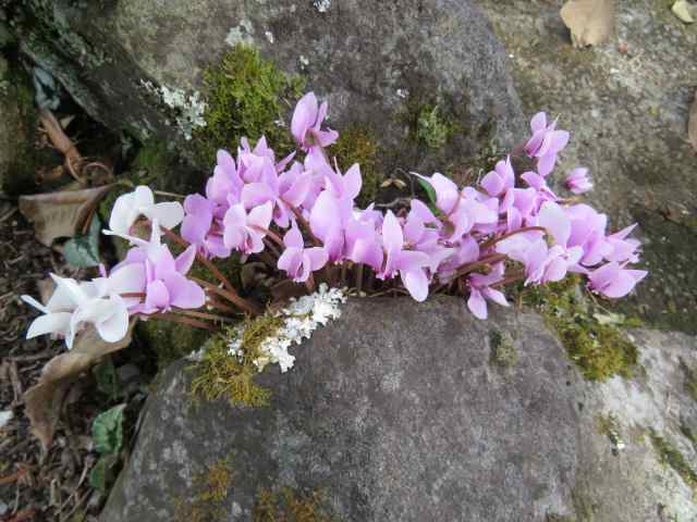 The rockery is a carpet of Cyclamen hederifolium, in shades of pink and white. Sometimes referred to as the ivy-leaf cyclamen, it is native to the Mediterranean area and one of the most amenable and easy to grow species. These days, we mostly let them seed down in situ and from time to time, I will lift clumps of tubers when they get too congested. We have also had success naturalising them on bulb hillsides in meadow conditions but we need to get the summer cut on the grass done at the right time so we can see the flowers. Somewhat to Mark’s surprise, just scattering seed proved as effective as planting tubers but it does take a few years for them to get enough size to be visible.