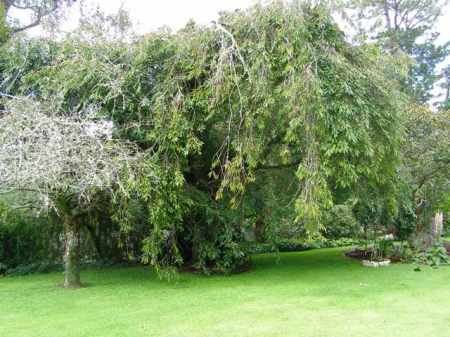 1) This garden aspect is generally all right but you would not look twice at it. The large tree is a weeping cherry, Prunus subhirtella pendula. The fact that the left hand tree, a malus or flowering crabapple, has no leaves on it in high summer is a bit of a giveaway. It is dead.