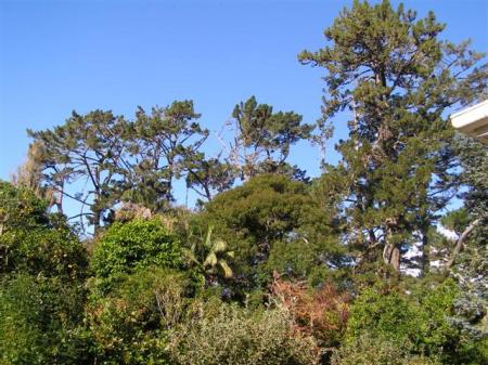 Occasionally we lose a pine tree – running about once every fifteen years at the moment – and the last one dropped itself in the one clear space that we would have chosen had we deliberately felled it, doing minimal damage as it crashed down but gouging out a 30cm deep indentation on the ground. Because they started life as a shelter belt and are planted in more or less straight rows, they now give us a woodland avenue below to grow frost tender material such as vireya rhododendrons, cymbidium orchids, monstera delicosa and a range of woodland bulbs. Such is their location, they would have to removed by logging helicopter but we are happy to live with them as a characterful backdrop.