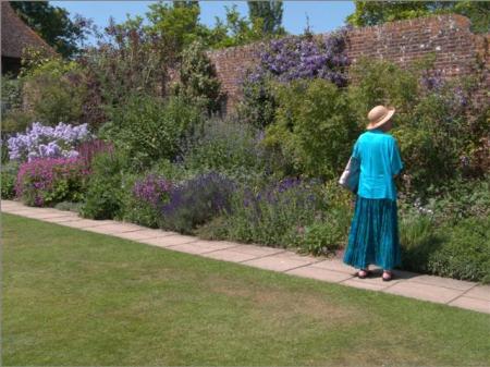 A random stranger in blue beside the blue and purple border at Sissinghurst