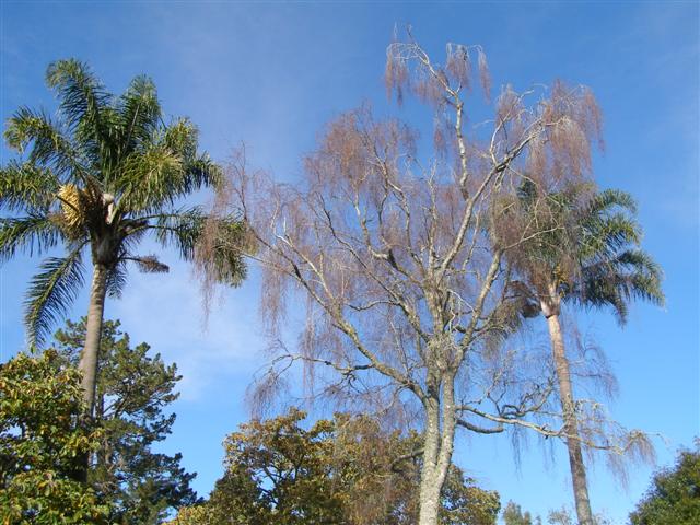 Flagging it on either side are large Queen palms (Syagrus romanzoffiana) now over 50 years old and probably up to 20 metres high. Felix Jury grew these from seed sourced from the Sydney Botanic Gardens. It is a bit of a meeting of two continents, Europe and Brazil – the betula and the palms side by side.