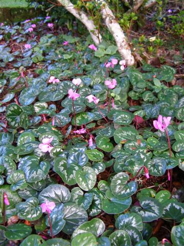 These winter flowering cyclamen are a delight and over the years we have increased their numbers so that we can use them to carpet beneath the light canopies of large evergreen azaleas (also coming in to flower now) and in open woodland areas. They have a remarkably long flowering season of months but don’t hold on to their foliage very long after flowering and their corms are quite small, so they discreetly disappear amongst the leaf litter when dormant.