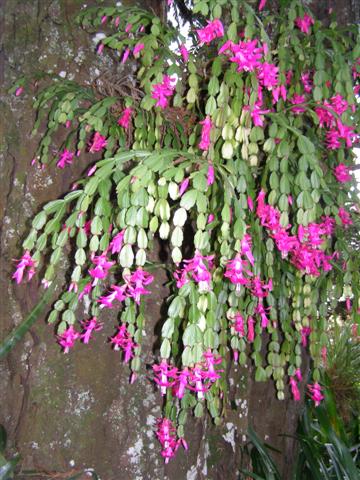 By way of contrast, the exotica of the chain cactus or zygocactus (schlumberga?) lightens up the dark woodland areas and is maintenance free and undemanding. We grow them as epiphytes, nestled into forks of trees or positioned on top of tree fern stumps. They have to be frost free and are generally grown in house plants throughout the world and they add a splash of cheering winter colour which I prefer to polyanthus.