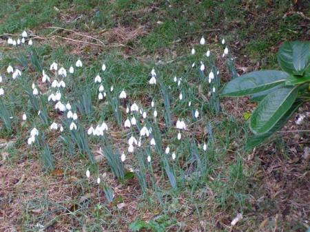 Naturalising the snowdrops takes some special efforts here. The rhododendron leaf belongs to a sino nuttallii