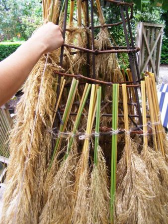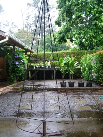 2) We were fortunate to be given a permanent metal base in the shape of a pyramid but you could construct your own from bamboo or a similar material. It needs to be fairly stable to work with easily. You need five or six vertical struts in order to be able to achieve a circular effect. Do not make it too wide if it needs to fit through a conventional door to get it inside when finished.
