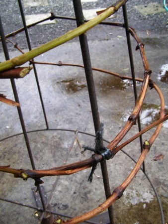 3) We wove additional horizontal supports into the frame at 20cm intervals using flexible lengths of old grape vine prunings.