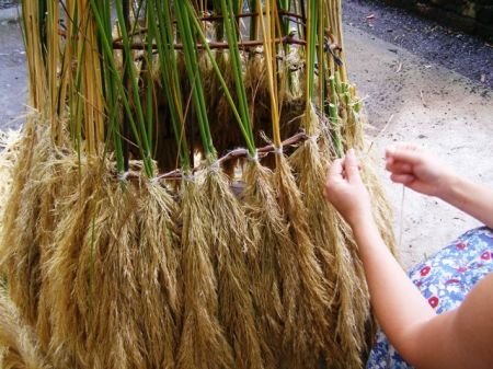 4) Starting from the base, tie groups of about three toetoe plumes at a time, forming the bottom layer of the skirt. It needs to be sufficiently dense not to see through. We tied firmly with neutal coloured wool, securing the plumes to the frame and the rings of grapevine.