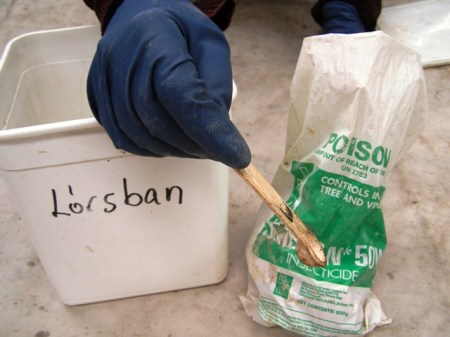 2) We use a very small quantity of Lorsban (available to approved handlers only) but any powdered insecticide will work. Carbaryl is widely used. The critical detail is that it needs to be in powder form because you are relying on the wasps unwittingly transferring the powder into the nest. Use gloves whenever handling insecticide as a safety precaution.