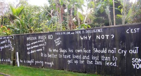 Some of Clive’s work is edgy, even flamboyant, and pushes boundaries in unexpected ways. A plain board fence at the entrance has been transformed into a statement by using witty wall writing – it is rather too whimsical and well executed to be described as graffiti.