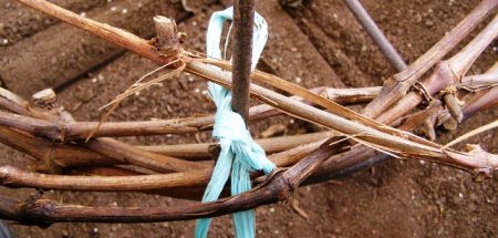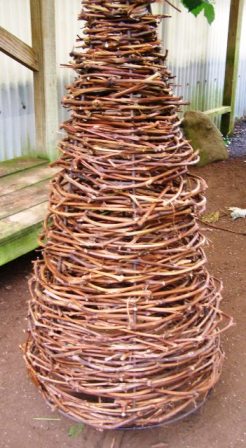 We saved the grape vine stems from the winter pruning round and kept them under cover. It takes quite a few and I only just had sufficient. Any flexible, long whippy growths could be used – willow, soft canes or wisteria come to mind.