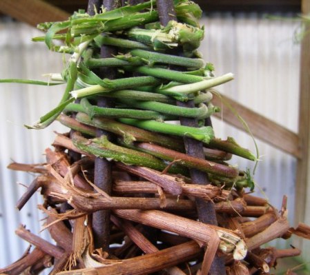Build in layers by simple weaving. I tied the first rows in place temporarily, to hold them in place. By the following day, they had set in place and no longer wanted to spring out.