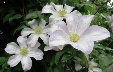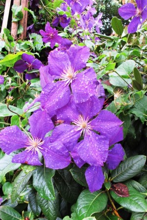 The clematis remain valiant stars in all this dreary weather. We have lost the names on all of them though, should we feel the need, we know how we can get them identified. We have dug out the ones that are too rampant and thuggish in their ways and I remain unconvinced at the idea of ground cover types (too strong and choking). But given something to climb up, we have a range which are quiet and undemanding performers. All I do is cut them down once or twice a year to near ground level. Beyond that, they just get the standard treatment of other plants in the borders (a mulch of compost). I was told by a clematis expert that most of the hybrids can be cut back very hard after flowering, fed, watered and they will return with a new flush of blooms in six weeks time. I haven’t timed it, but it did make me realise that many clematis are not shy and timid plants and can take fairly ruthless handling. Should you feel the need to make a bamboo obelisk (you can just catch a glimpse of one supporting the clematis in the photo below, we gave step by step instructions in an earlier Outdoor Classroom.