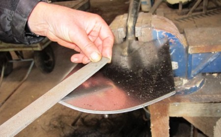 3) Only ever sharpen one side of a spade or push hoe – the side that faces upwards. With a push hoe, this keeps the blade flat to the ground with the cutting angle on the upper side. Spades cut better with one flat side and the upward or outward side bevelled and sharpened. We use a file to sharpen the blade. Home handypeople may go so far as to use an angle grinder but be careful not to overheat the garden tool or you will lose the temper (hardness) of the blade.
