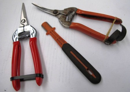 6) A quick-fix sharpen for secateurs and scissors can be achieved with this handy little tool from garden retail outlets. It is also the only way we know of sharpening cheap secateurs held together by rivet, or the grape snips with upward curving blades. Run it along the angled edge of the cutting blade about six times. Remember to sharpen only the bevelled side of each blade. This tool is made by Bahco though there are other brands on the market.