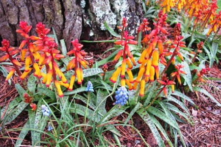 As a contrast to the candy pinks, I photographed the lachenalias and muscari (grape hyacinths) below which nestle in around the trunk of one of our old pine trees. The muscari evoke childhood memories for me. I admit that Lachenalia aloides is not my favourite lachenalia – they are a little garish, looking maybe as if they made from plastic and sold at a cheap store but they provide a cheerful splash of colour in a naturalised setting.