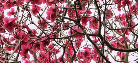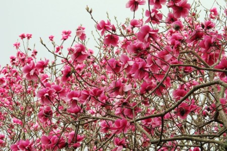 I figured yesterday, as I took these photos, that some (though fewer in number these days) favour floral wallpaper in their home. Here we have floral skypaper instead. Sometimes I worry that many of my magnolia photographs are taken from below, looking up to the sky whereas other people’s magnolia photos are taken looking down on the individual blooms. The reason is that so many of our magnolias are now achieving quite some stature so our close up view does tend to be looking upwards at them. But no matter which way you look at them, magnolias make a breathtakingly lovely display. We still have many which are just opening their first blooms or not even showing colour yet and we look forward to the season continuing right through September. Our early display, in full bloom now, is heavily dominated by the stronger coloured reds, purples and deepest pinks – the two photos here of unnamed seedlings – which we grow so well here. We appear to get deeper colours here than other parts of the world which is presumably related to soil conditions and to the quality of very clear, pure light we have. Mid and later season magnolias are more inclined to the pales and whites.
