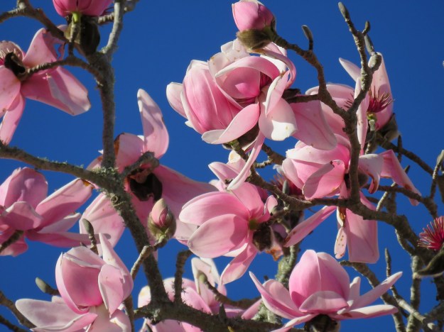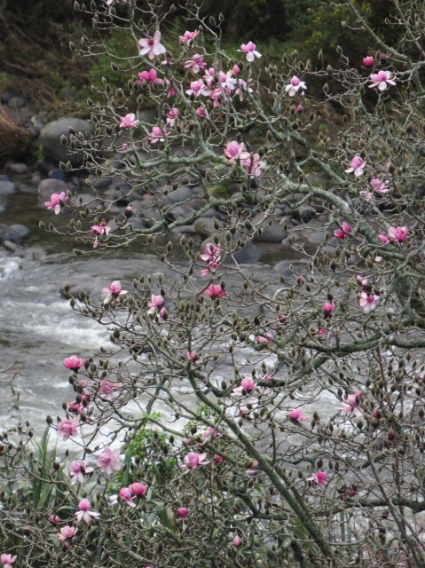 In the heart of wintry July, M. campbellii is the first magnolia to open and promises the delight of a new spring. At least, that is when our tree blooms. All the tarseal and concrete in the central city of New Plymouth lifts the temperature and the cluster of trees in the Huatoki Reserve by Powderham Street open their first flowers in June, before they have even shed all their autumn foliage.