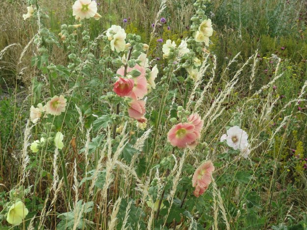 But we found the hollyhocks in London. An entire block of them growing wild. This was part of the Olympic Village plantings. Most of these plantings were prairie-flavoured while hollyhocks are pretty much traditional cottage-garden plants. This may be why they were kept separate and all on their lonesome. They made us smile. I am only guessing that the other plants like the mullein and Verbena bonariensis have introduced themselves to the hollyhock party.