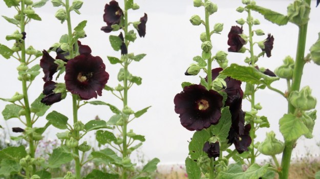 As a postscript, once we had our eye in for hollyhocks, we kept seeing them in the south of England, seeded down and naturalised by motorways as well as on traffic islands and on street verges. There is no shortage of hollyhocks there. Mark is now very tempted by some of the buff shades, if he can find the seed.