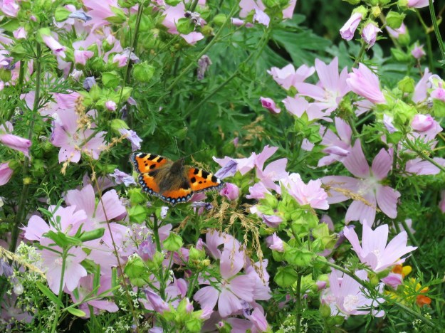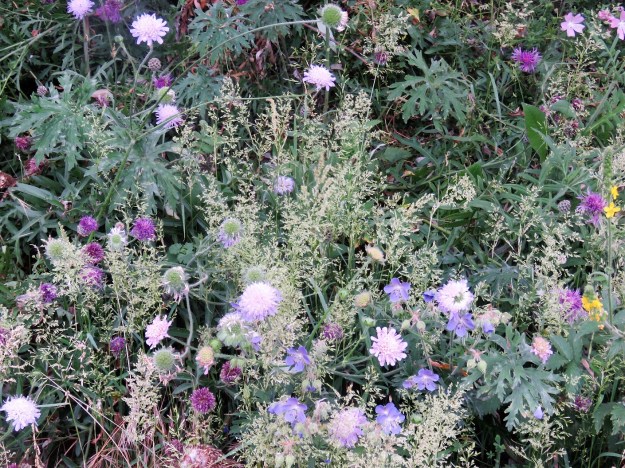 My heart will never sing at the sight of sprayed edges, mown grass and bedding plants, be they in rows, blocks or circles. But we exclaimed in delight as we wandered the areas around Olympic Park. I started gathering the flowers from one area, just to see how big the range was. The hollyhock block I wrote about earlier was on the perimeter of these plantings.