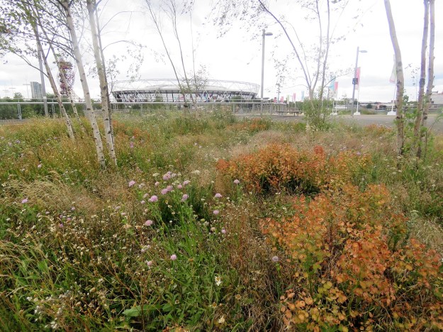 From Dunnett at the Barbican, we went on to Olympic Park – the site of the 2012 London Olympics. There was quite a lot of media coverage at the time and everything I read praised the Hitchmough and Dunnett plantings which were strongly naturalistic and meadow in style. I can’t think why we didn’t go and see it when we were over in 2014 so I was determined to get there this time. The perennial plantings presumably went in some time in 2011 to allow them to get established so they must be in the sixth year by now. Some may even have gone in a year earlier. Most of it will have been done from seed. Given this is an expansive area undergoing repurposing after the Olympic hype, I deduced that maintenance of the plantings would be minimal at best. What would survive under a laissez-faire regime?