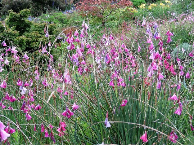 If you are not much interested in plants themselves, you can admire the scenes he composes These can be like Impressionist paintings though perhaps more Georges Seurat and pointillism than Monet. I am sure it is no coincidence that Ros Wiley is also a painter who prefers flowers and landscape as her subjects. But we are interested in the plants and plant combinations as well. Presumably Wiley has one of the most comprehensive collections of dieramas (angel’s fishing rods) around but they are used throughout and not all concentrated in one block, as “national collections” are usually displayed. We were in the wrong season for the erythroniums for which this garden is renowned but it also has extensive collections of different daphnes, cyclamen, Japanese maples, kniphofia, roscoeas, agapanthus and a host of other bulbs, perennials and smaller growing woody plants.