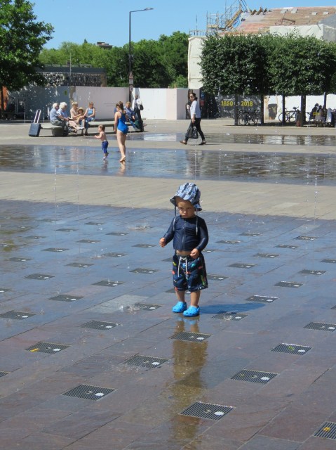 Upon entering a small precinct named Handyside Gardens, what did we see? A sandpit! A sandpit designed to be used by children. I asked the dad’s permission before photographing him with his little boy in the sand. Sure it is surrounded by tall buildings so shade must be an issue, but that is the nature of inner city living. This was an area that had been designed to give a series of intimate spaces with lots of different seating areas. Leading out from the sandpit was a rill or small canal of flowing water which looked clean and inviting for children to play in. Indeed some of the sand had made its way into the rill. “Wait til you see the fountain,” said the father in the sandpit.