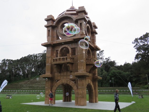 In the fading light of late afternoon, a one-day cardboard tower on the cricket field at Pukekura Park (with bubbles)