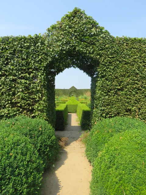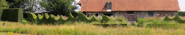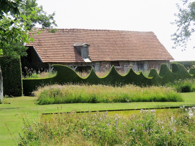 Green walls. Or hedges as they are usually called. We were amazed at the tightly clipped, breaking wave hedges at Le Jardin Plume in France, having never seen anything quite like it. They contain the feather garden for which the entire property is named and as such, perform both a practical and aesthetic function. On that practical level, they shelter the very large perennials which could otherwise be beaten down by summer thunderstorms and, presumably, winds sweeping across the flat landscape. And the tight clipping and distinctive form are a complete contrast to the dynamic waves of grasses and tall, slender perennials.