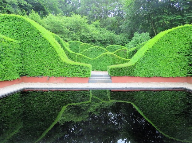 We visited another heavily hedged garden in this northern summer just passed. Veddw is in the Welsh borderlands and the owners have used hedging throughout to create the form and structure they were after. In one of the hedged enclosures, they have done a gentler take on rounded shapes, evocative of their wider landscape of rolling hills. It is a sculptural approach where the interest lies in the shapes and reflections in the black pool, not in the plants themselves.