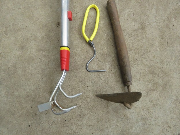 My new Wolf-Garten cultivator, the modest Wonder Weeder and my short handled hoeing implement deal to most weeding situations