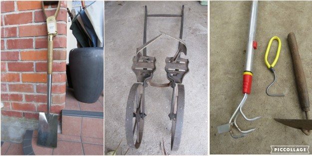Left to right: my excellent Joseph Bentley border spade with its oak handle, Mark’s prized Planet Junior that he uses to cultivate the soils in his vegetable patches and the smart Wolf-Garten cultivator