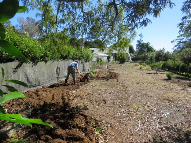 Rotary hoeing one of the new borders to break up heavily compacted ground