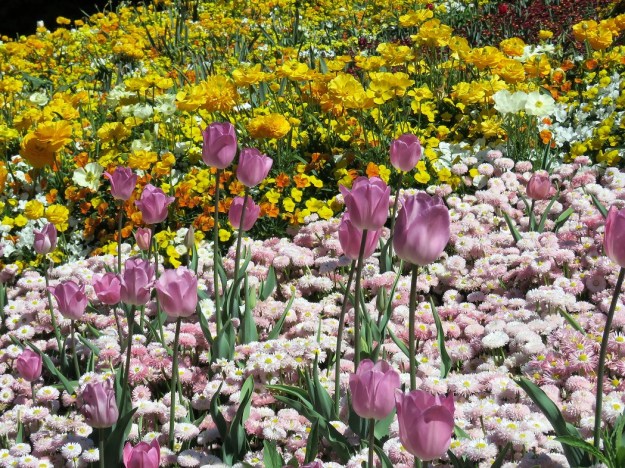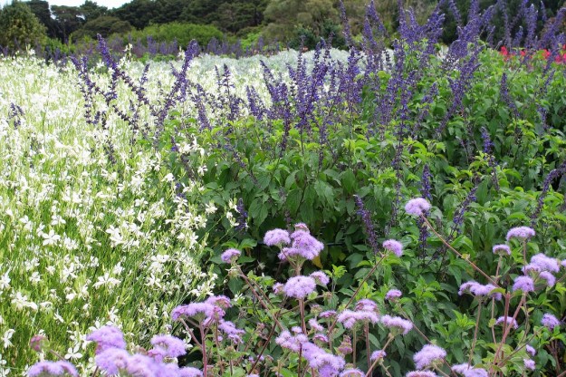 The one colour combination that I personally dislike intensely is pink and yellow. I have seen it looking pretty in clear pastel pink and lemon in a tulip display in Eden Gardens in Auckland, but hideous in a display at Floriade in Canberra. It is so easy to get wrong. There are many murky shades of pink – pinks with brown or purple tones within them – which can look lovely in combination with other colours. But put them with hard yellows and I shudder. There are plenty of plants to choose from. I have seen many a murky pink with yellow variegated foliage which have managed to achieve the combination in a single plant. I am not at all keen the combination of a bright yellow kowhai and the cerise pink of a cercis that I drive by each spring in a nearby garden. Nor do I like bright yellow grasses combined with pale pink flowers. But that is entirely personal taste. If a carefully colour controlled garden is what you want and pink and yellow pleases your eye, go for it. Don’t let me put you off.