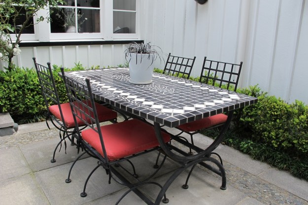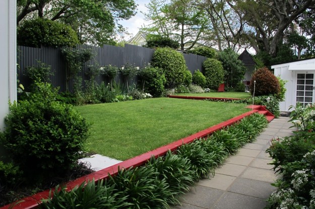 In New Plymouth, Judy Gopperth, opens her garden called Hirst Cottage for the annual garden festival at the beginning of November each year. Hers is one of the few places I have seen that has a totally disciplined approach to colour management in a smaller town garden. Basically, it is themed on red and white. Except it is more a case of theming on white and green (as she describes it herself) with red highlights and black as a background. The red appears mainly in small touches in the hard landscaping and the soft furnishing and it creates a bold contrast to the dominant white and green. It is a completely controlled use of colour which unites the outdoor space with the house (in her case, a very early historic cottage).