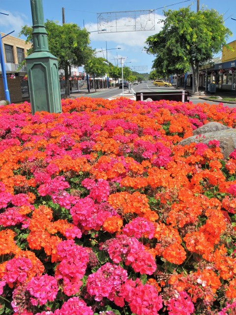 Orange and bright pink on a traffic island in our local town of Waitara. Bedding plants give a massed display that are rarely seen in a home garden but can give ideas for colour combinations