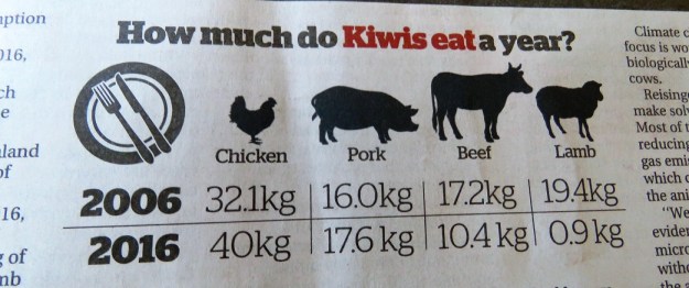 My little piece was part of a double page spread, the first of a three-part series looking at the environmental impacts of meat. I found the chart detailing the average New Zealand meat consumption interesting. Overall consumption is declining but lamb sales have collapsed. I think this is a damning indictment of the lamb industry and its failure to adapt to changing eating styles (particularly the decline of the large Sunday roast). Now that we eat so little meat, when we get the occasional craving, it is red meat we want and I try to buy lamb or free-range pork rather than beef because the environmental footprint of NZ lamb is way better. Never have either of us have felt a craving for chicken and I am sure the increasing chicken consumption is entirely to do with good marketing, the low price points and repackaging the meat as a quick-cooking convenience food. Ethically, I think the factory farming of chicken is a big issue even if its environmental impact is lower than beef.