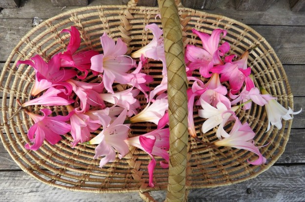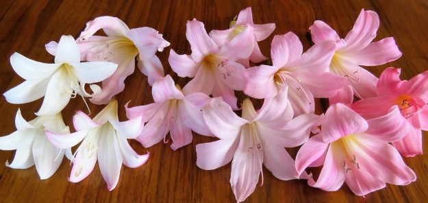 Needing a break from a garden task, I wandered around with my flower basket, curious as to how much variation there is in the belladonna flowers still in bloom, given that ours are all seedlings. A fair amount, it turns out, in colour and size. This was not an exhaustive survey into the average number of blooms per flower spike, variations in flower form and length of time in bloom. There are limits to how interested I am in this particular genus.