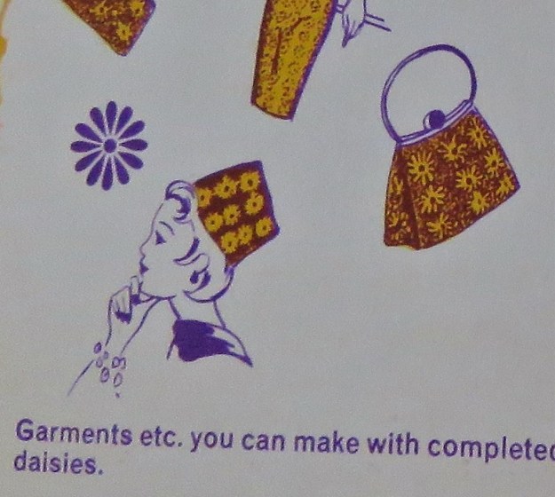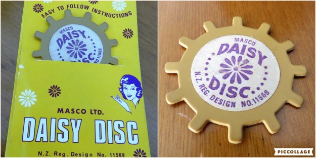 In sorting out my haberdashery – in other words, reorganising my sewing desk – I came across this delight, the Daisy Disc. I can’t recall having noticed this before so it must date back to my very late mother-in-law whose sewing desk I inherited. I see it has the price of 30c on it, so I can date it to post July 10, 1967 when New Zealand swapped to decimal currency. It was the instruction folder that delighted me, with its pictures of projects and the following bold statement: