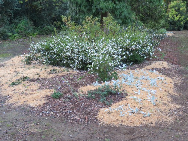 The grass garden took priority. Over on the other side of this new area, I have nearly finished planting out the caterpillar garden. It is a very different style of planting, far lower and more restrained although the area involved is similar – about 30 metres long and up to 8 metres wide. It is also under siege from the local rabbit population. I find the rabbits generally leave the plants alone if they are surrounded by wood shavings. We have tried various strategies to deal to the rabbits but have grown desperate enough to think we may have to resort to poison. For us that is really desperate. We prefer to keep to trapping or shooting vermin rather than poisoning. It will be interesting to see how quickly this area fills out. The planting has again been carried out using relocated material – from the former rose garden that I have been stripping out. No plants have been purchased. But even I am amazed at how many plants it takes to fill in a blank space – hundreds and hundreds of divisions, maybe thousands. Mind you, I am planting closely. That is how I will get a carpet covering within the year.