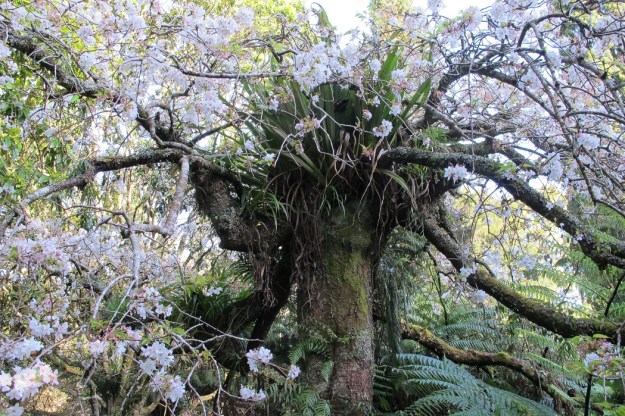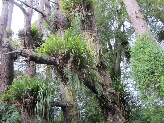 One of the characteristics of New Zealand native forest is the high incidence of epiphytes which are simply organisms (in this case, plants) that grow on the surface of another plant, getting moisture and such nutrients as they need from the air and rain and then from the debris that builds up around them. Because these epiphytes are perched up trees, they are vulnerable to drying out so are more commonly found in areas protected by other trees rather than on solitary specimens standing in exposed isolation. We also get regular rain here and have high humidity levels no matter the season. Add to that the fact that our native forest and bush is almost entirely evergreen. There are very few deciduous natives – a total of only 11 different species that are fully deciduous in winter. Most New Zealand gardens use a wide range of evergreen plants and shrubs, usually outnumbering the deciduous selections. So we have situations that are hospitable to epiphytes.