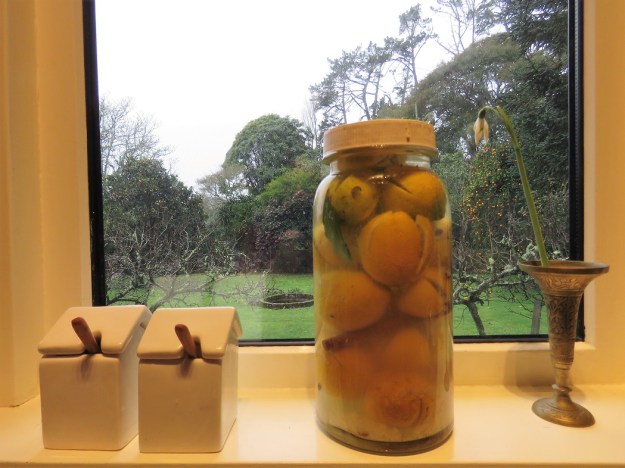 Before we left, I made another jar of salted lemons, having noticed a heavy crop and smaller fruit on our main tree. Smaller fruit fit in the jar better. I prefer to make salted limes but the lime tree is having a year (or two) off fruiting. They are dead easy to do, store for many months in the fridge and are very tasty as a flavour addition. They can make couscous flavourful (though I have gone off couscous since I realised how highly processed this product is), add taste to rice and all manner of stuffings or savoury dishes. I resorted to buying lemons one year, in the absence of a good lemon crop at home, but if you are buying fruit, pour boiling water over them and stand them for a few minutes first. Some are, I read, coated (in wax?) to help their storage life and you need to get rid of any coating or spray residues before preserving them.