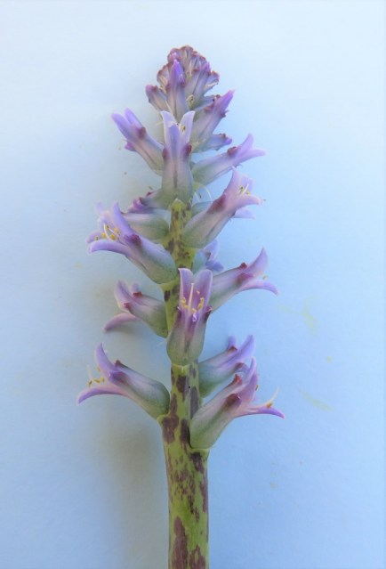 In the blues the absolute stand-out is Lachenalia glaucina, or at least the good forms of it. It can throw a lot of seedling variation. It was difficult as a nursery plant, partly because it was frost tender and we were growing the bulbs in open conditions, not under cover. Over the years, it has become one of most successful varieties in the garden – in an understated sort of way. I used to encourage less experienced gardeners to choose L. mutabilis instead because it was much easier and more reliable, while still a good blue. Now I can tell you that it was easier in a pot. I am not even sure that we still have it growing in the garden. I rounded up one somewhat moth-eaten flower from a bulb that is struggling on in the heap where we dump our used bark potting mix. The other blues we used to grow like unicolor, mediana, and ‘Te Puke Blue’ have not thrived in garden conditions and the only plants we have left are in Mark’s covered house, where only he ever gets to see them. The same with the beautiful cream lachenalia with the terrible name of L pustulata (on account of its warty leaves).