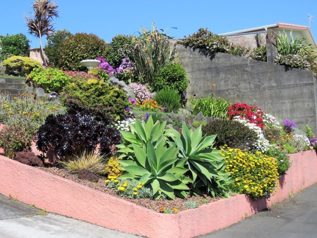 Down near one of the city beaches, I saw this very colourful front garden on a steep slope. I wrote a piece back in early 2013 about city gardening on a steep slope and I see it still comes up in internet searches. This one is clearly a big challenge, right by the beach, so subject to salt winds and the house is at the top of the section. The access driveway was so steep that it had steps up the centre of it, between the wheel tracks. It is also what I describe as a generous garden. It is not as though the owners will use this outdoor space for recreation. It exists primarily to bring pleasure to passers-by and the owners have worked very hard to achieve this colourful and lush view. The section has been terraced, retained and permanent steps made to give access. It may not to be everybody’s taste but it takes a keen gardener to create and present a garden well in such an exposed and unpromising situation. And it certainly eclipsed the hanging garden of Strandon on the neighbouring property.