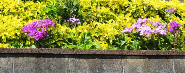 Purple and acid yellow atop a substantial, unadorned concrete block retaining wall.