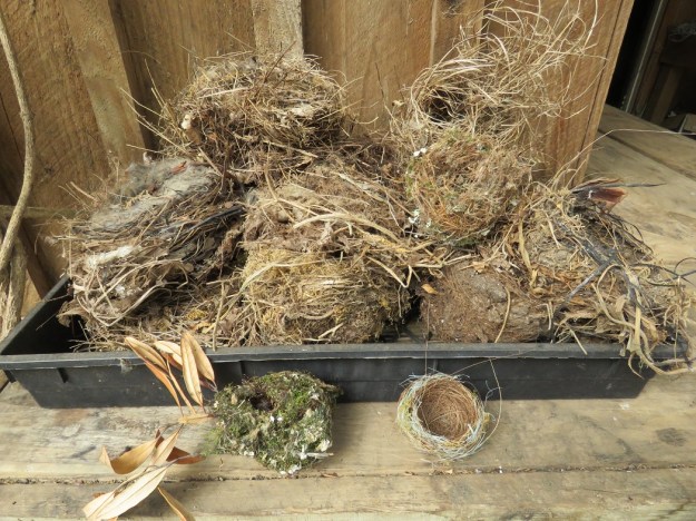 In relation to your birds nest collection: I have, over the past three weeks, been watching the starlings in my backyard stripping leaves from various herbs (which are all growing in pots), and flying away with great beaksful of greenery. They have attacked the parsley, sage, and mint, but their absolute favourite is the marjoram, which is still very lush and has not put up any flowering stems yet. I have never seen this behaviour before, yet I have been growing herbs in pots for over 40 years. We can not decide whether they are weaving the foliage into their nests, or are perhaps feeding them to their fledglings. Have you seen this yourself, Abby, or do you have any idea what might be going on here?