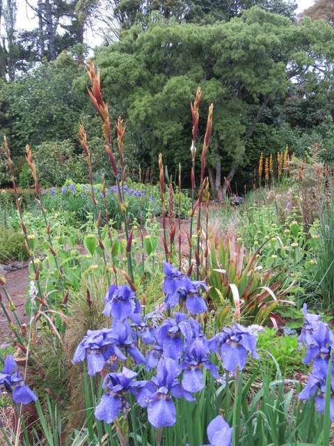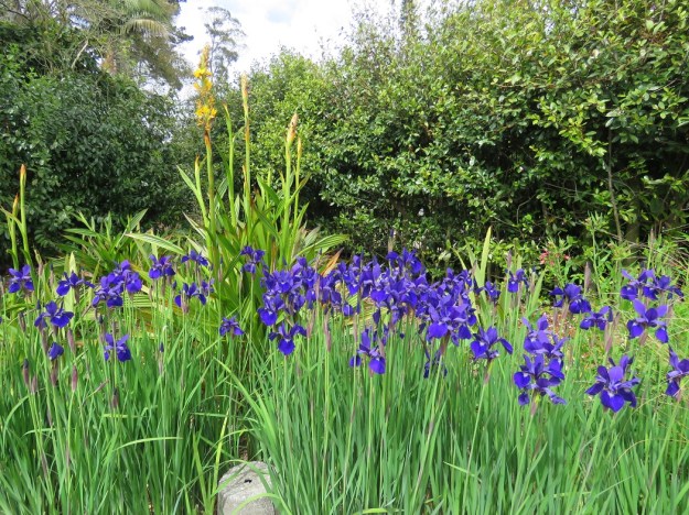 Iris sibirica, or the Siberian iris, is very hardy, undemanding – so low maintenance – and fully deciduous which means that it emerges afresh each spring. I had assumed it came from Siberia, and it does grow there but its natural distribution is from northern and central Europe right across to Central Asia (which includes Siberia). In the wild, it is a damp woodland plant, preferring full sun to part shade. Presumably, woodlands in that part of the world are largely deciduous. The received wisdom here has always been that they grow well in heavy soils and are ideal beside ponds and waterways, though they do not grow IN the water but BESIDE it. In Taranaki open gardens, they are usually combined with the bright yellow Primula helodoxa because both grow in similar conditions and flower at the same time, conveniently at the peak garden visitor period.
